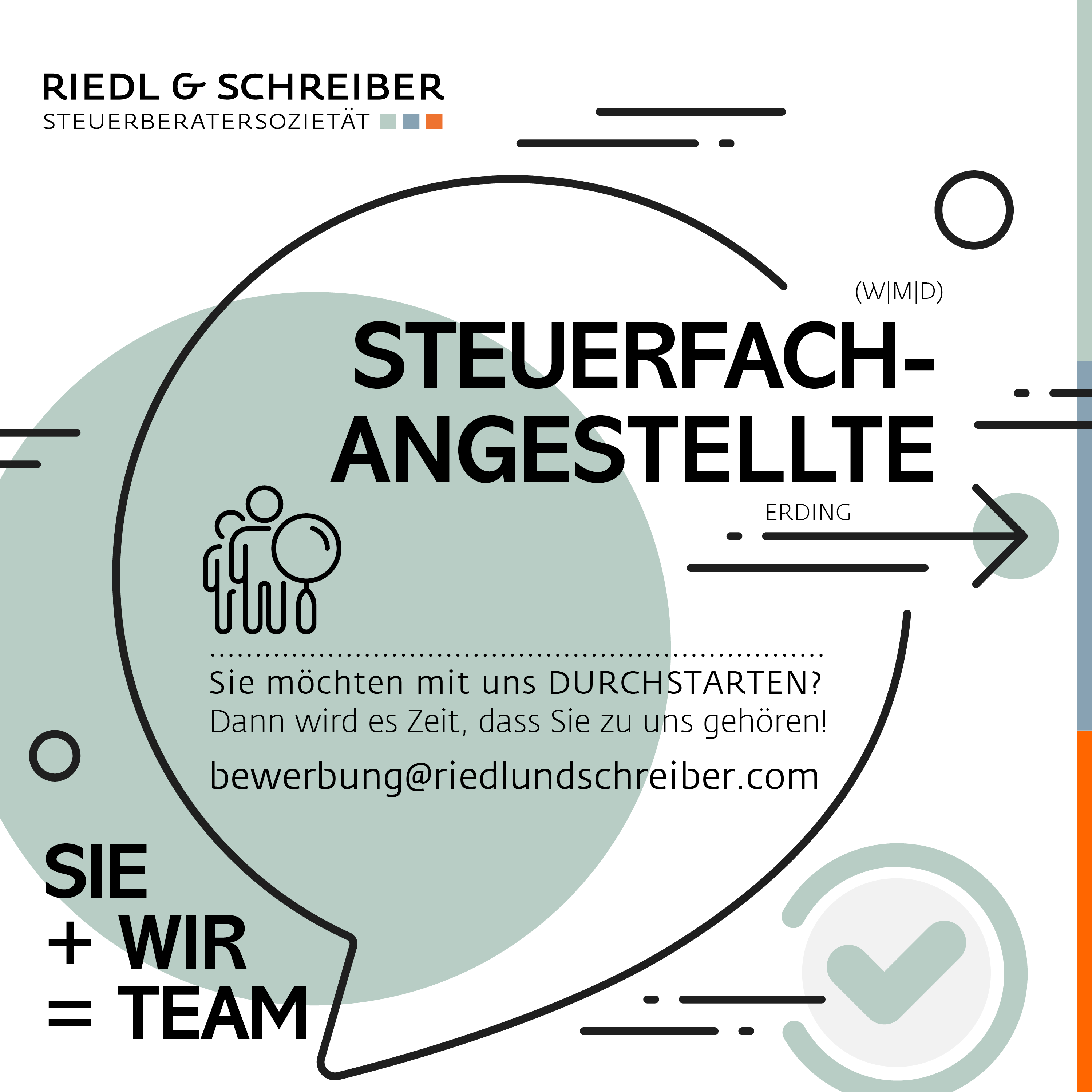 Wir, die Steu­er­be­ra­ter­so­zie­tät Riedl & Schrei­ber, suchen enga­gier­te Steu­er­fach­an­stell­te für die Stand­or­te Moos­burg und Erding in Vollzeit.